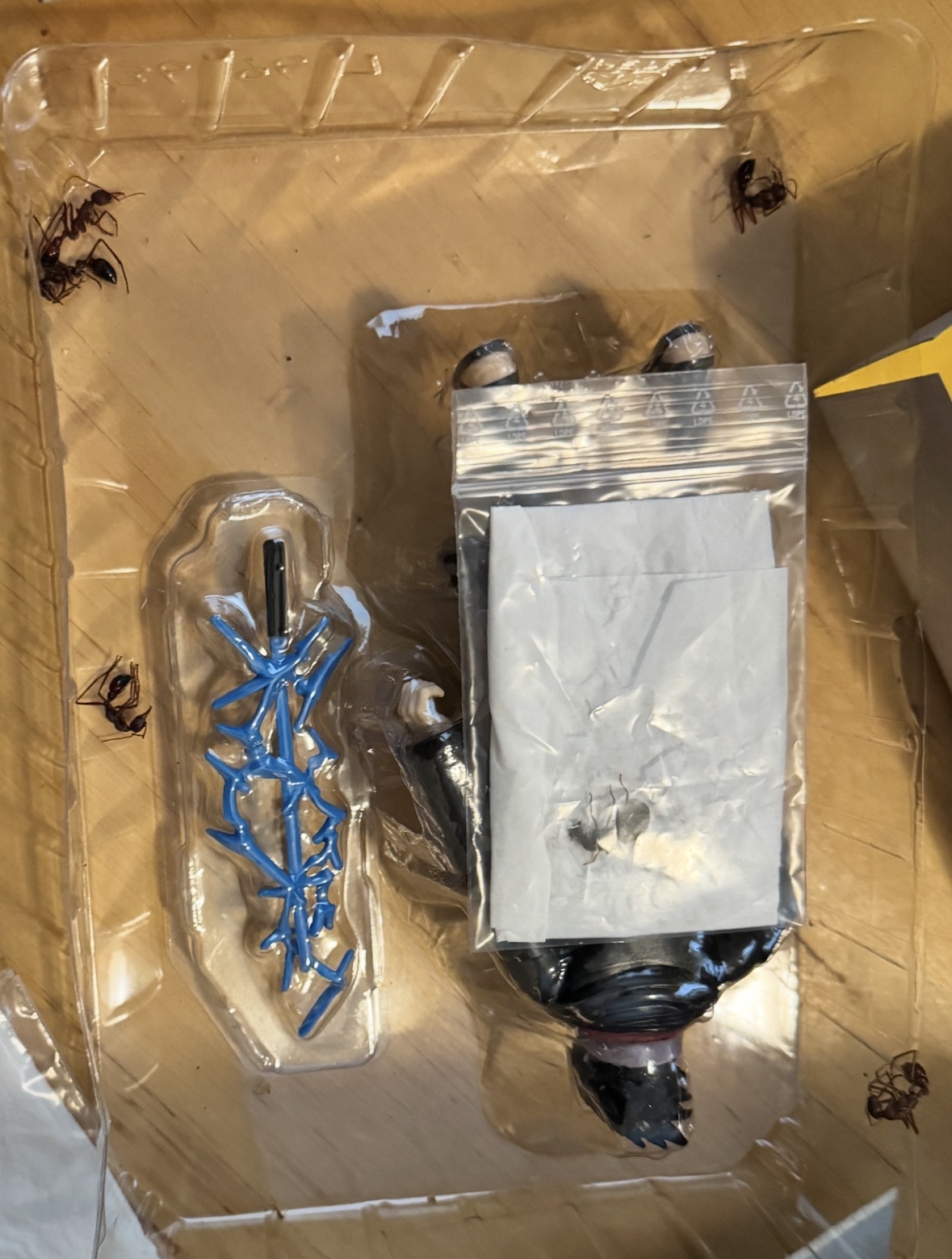 I bought $1,500 of ants and expected safe and careful shipping. But when I opened the box, I found that the ants were stuffed into little wet baggies where they could barely move. The bags were tumbling around loosely in a flimsy toy box with no insulation from the cold. Many of the ants escaped their bags. All of the ants were DEAD — including FIVE QUEENS.
